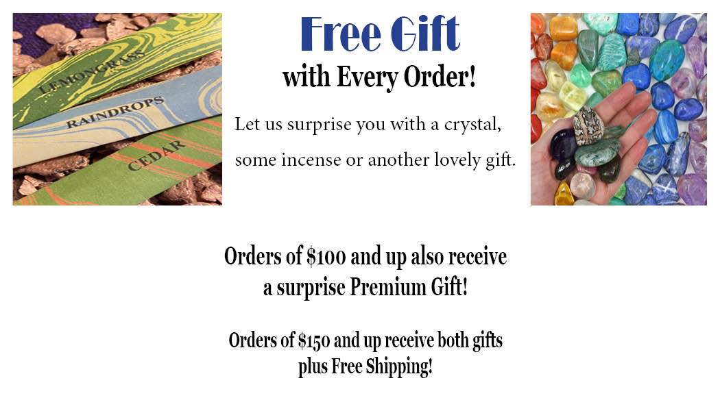 Every online order receives a free gift of mini incense sticks, a crystal or other nice surprise!