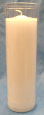 White wax in a plastic cylinder. Burn candle in cylinder. Candle is 7" tall, 2 1/4" diameter, cylinder size is 8" tall, 2 1/2" diameter. Case contains 24 candles in cylinders.