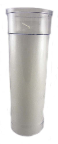 White wax in a plastic cylinder. Burn candle in cylinder. Candle is 7" tall, 2 1/4" diameter, cylinder size is 8" tall, 2 1/2" diameter.