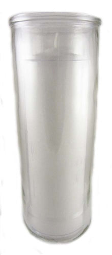 Colored glass outside, with disposable plastic candle insert. 8 1/4" tall, 3" diameter. Insert wax is white.