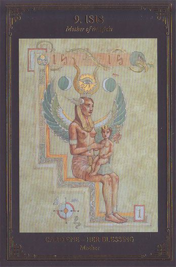Goddesses from around the world with a card each for Her phase as Maiden, Mother, and Crone, depicted in antique style art, with gold metallic ink card titles, which tell who She is, her job, and which phase she represents. The book has a blessing for each goddess, and an invocation.