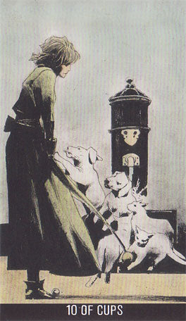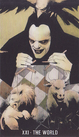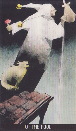 Accept the invitation of the Joker to step into a world of madness realized in grunge colors and dark, triggering art, with very much the vibe of Weimar Berlin. This deck, partially but not totally based on the Rider format, is designed to make you uncomfortable so you can see beyond the illusions. The meanings of each card are expressed by quotes from various famous people.