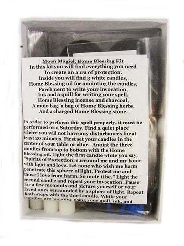 Kit includes: candles, ritual oil, parchment, ink, quill, incense, charcoal, mojo bag, herbs, stone and instructions.
