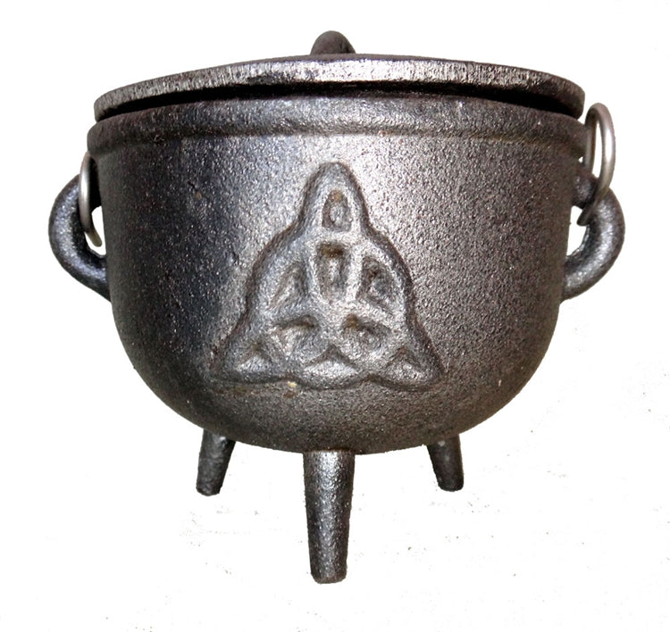 Cast iron cauldron with lid and bail, featuring raised metalwork triquetra on both sides. Use for burning things as part of spells or burning incense. 4" tall, 4 ½" diameter.