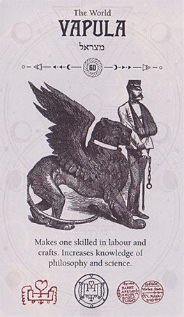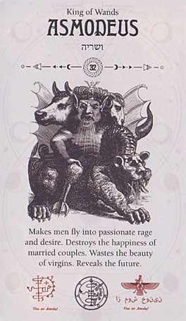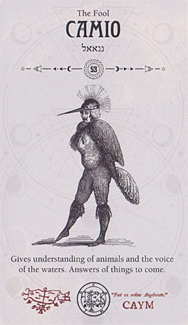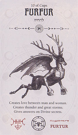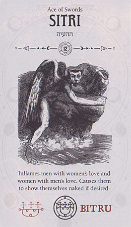 Based on Goeitian demons, this deck can be used for summoning said entities, for which the book contains instructions, or for divination or meditation. Each card features the name of a demon, a pen and ink drawing of it, its major power, name in Hebrew, and Solomonic seals and glyphs.