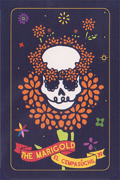 During the annual (traditionally Mexican) Día de los Muertos celebration, the family members of a person who has died will place items with special significance on a home altar in order to welcome the deceased. This ofrenda, or offering, may be quite large and elaborate. The initial inspiration for this deck came from San Diego’s close association with Mexico and this yearly celebration of the Dead that typically runs from October 31 through November 2. From those vivid images and joyful celebrations came the idea for this kit of colorful cards.