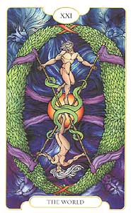 Different, but conjoined images for upright and reversed positions, in bright colors, with inked outlines. Very intense artwork, almost reminiscent of stained glass meets Manga.
