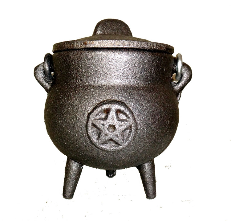 Sturdy cast iron cauldron! 4 inches tall, 3 inches in diameter, with raised metalwork pentagram design on both sides.