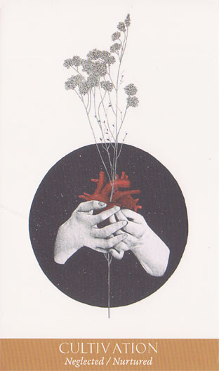 Designed to foster self reflection and growth, this features line art paired with computer art, mostly in black and white, with color used to highlight parts of the images, and keywords on each card which are opposing facets of the card title.
