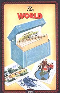 1950s icons of the nuclear family form a divination deck. With tablecloth-checked back and recipe box divider cards for Major Arcana, Minor Arcana and Instruction Book. Too cute!